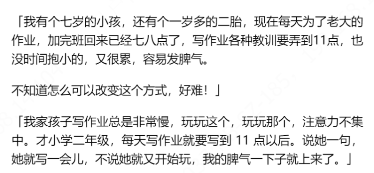 “不談做作業(yè)時,母慈子孝,連摟帶抱。一涉及到做作業(yè),雞飛狗跳,嗚嗷喊叫,讓路人恥笑,讓老人血壓升高,讓鄰居不能睡覺。