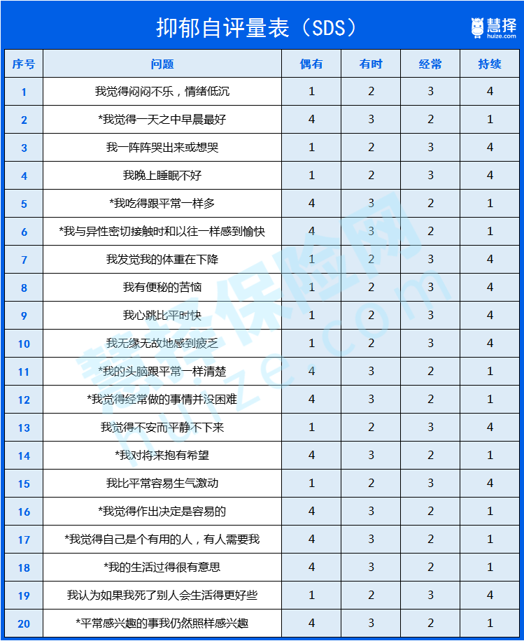 對(duì)于有抑郁癥狀的成年人,想知道自己有沒(méi)有得抑郁癥,可以做做下面這個(gè)“抑郁自評(píng)量表”(SDS)。