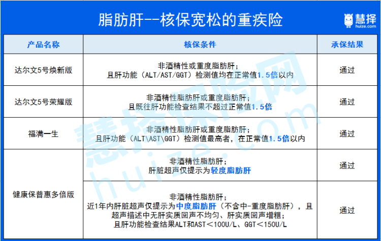 1.「 重疾險(xiǎn) 」方面,總體來講只要不是酒精性脂肪肝或重度脂肪肝,并且肝功能檢查在正常值的1.5倍以內(nèi),大部分重疾險(xiǎn)產(chǎn)品都可以正常承保。