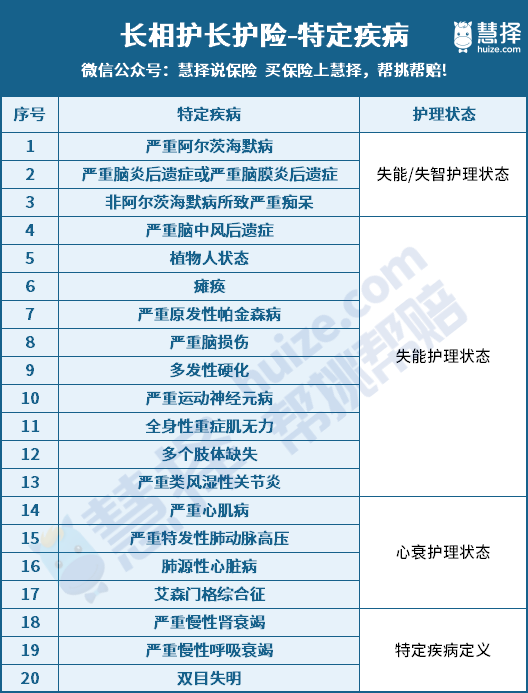 長(zhǎng)相護(hù)長(zhǎng)護(hù)險(xiǎn)覆蓋20種易導(dǎo)致失能失智的高發(fā)疾病。
