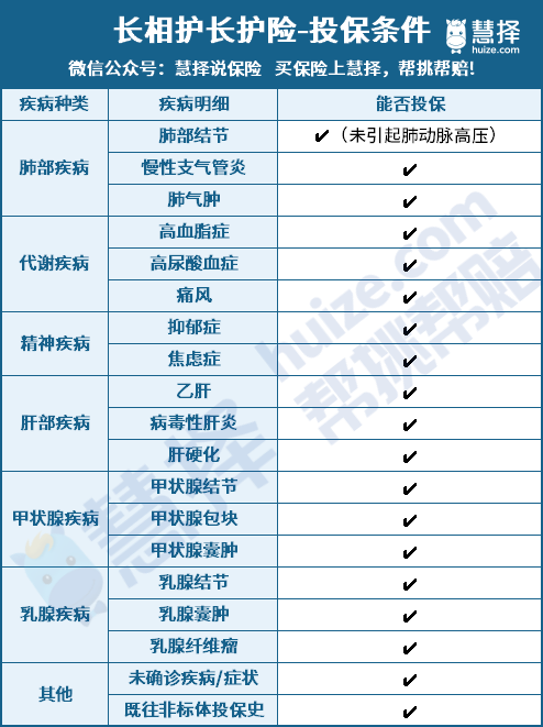 因長(zhǎng)相護(hù)長(zhǎng)護(hù)險(xiǎn)的健康告知寬松,像結(jié)節(jié)、抑郁癥、乙肝人群,可能會(huì)在投保重疾險(xiǎn)時(shí)被拒保。
