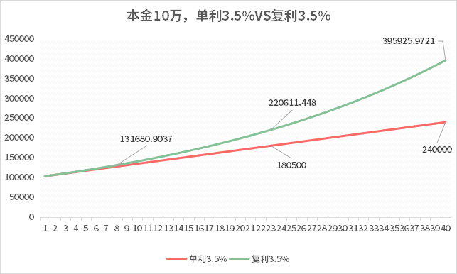 而年金險(xiǎn)的現(xiàn)金價(jià)值是復(fù)利增長(zhǎng),我們以3.5%利率(通常被稱作內(nèi)部收益率)做個(gè)對(duì)比。