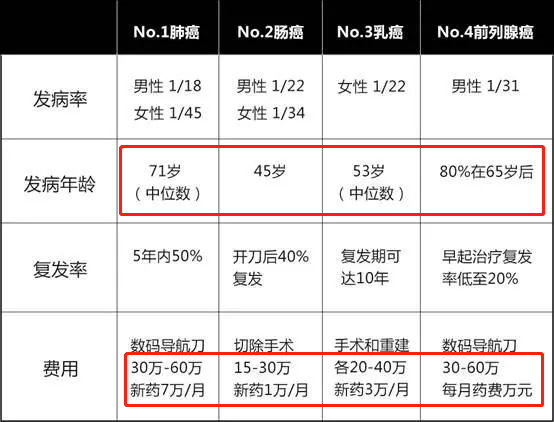 一些高發(fā)惡性腫瘤大多集中在40-65歲、甚至更靠后的年齡段: