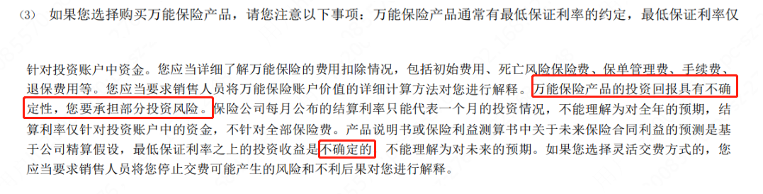 在萬能險(xiǎn)的合同里,多個(gè)地方都寫清楚了:投資收益不確定!不確定?。?/span>