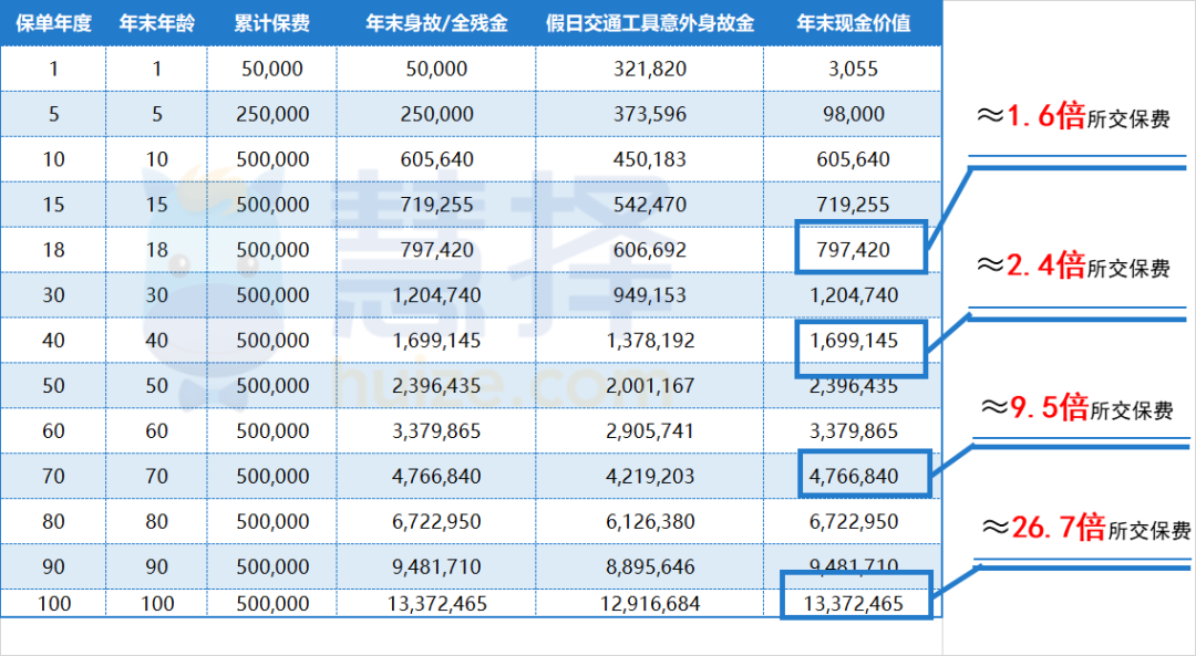 看下表【年末現(xiàn)金價值】一欄,就是投保人可以支配的金額。