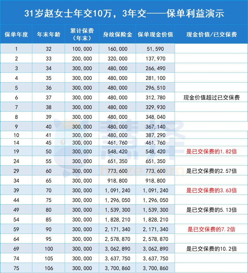 趙女士投保了一份10萬×3年交的金滿意足多多版增額終身壽險。