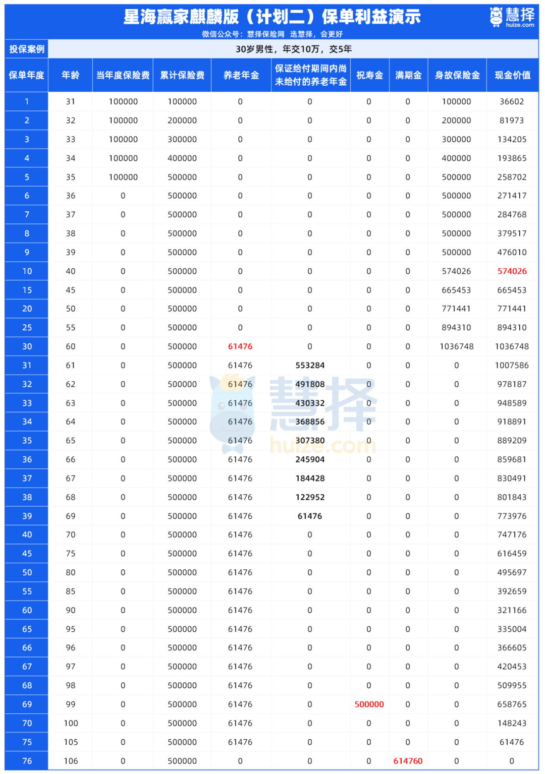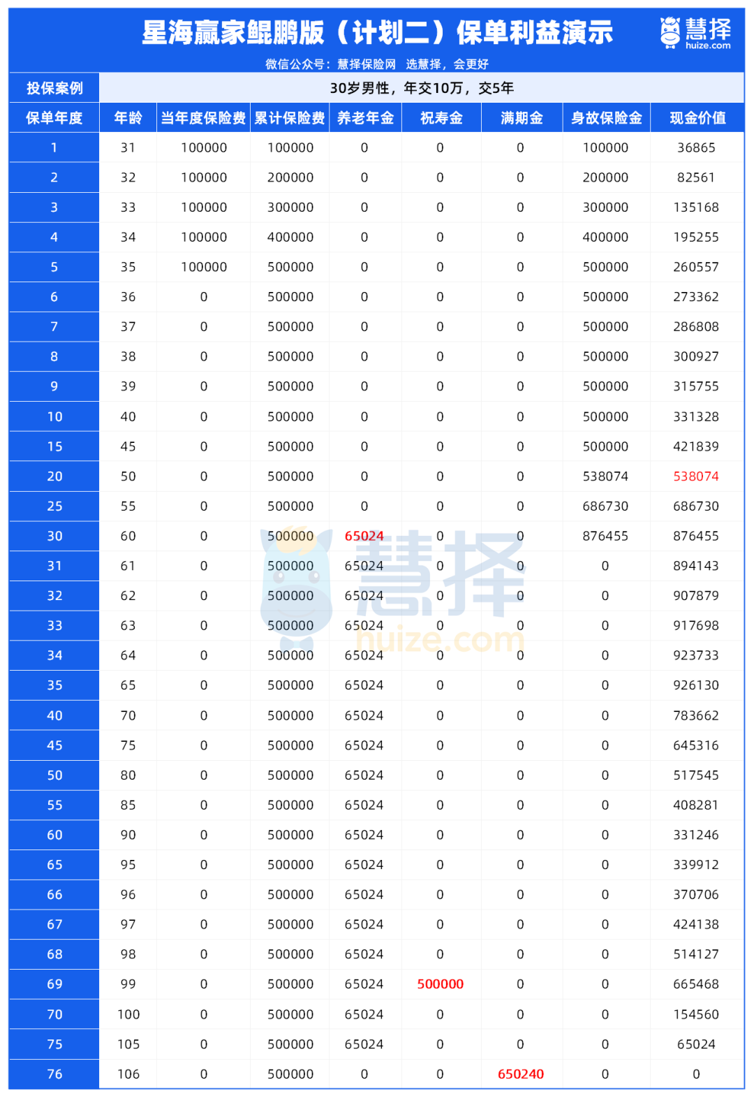 我們以30周歲德先生,年交10萬,交5年為例,看看星海贏家鯤鵬版和麒麟版的保單利益。