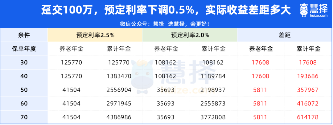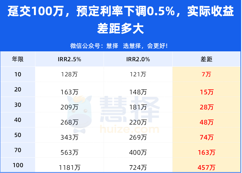 我們拿躉交100萬,預(yù)定利率下調(diào)至2.0%,測算一下收益差距: