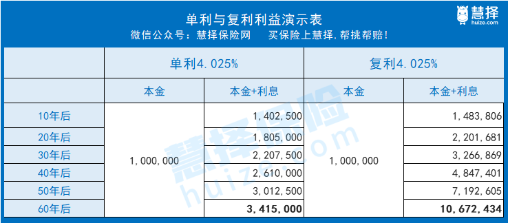 (可以看到,100萬本金,60年后復(fù)利4.025%總收益為1千多萬,而單利還不到350萬)