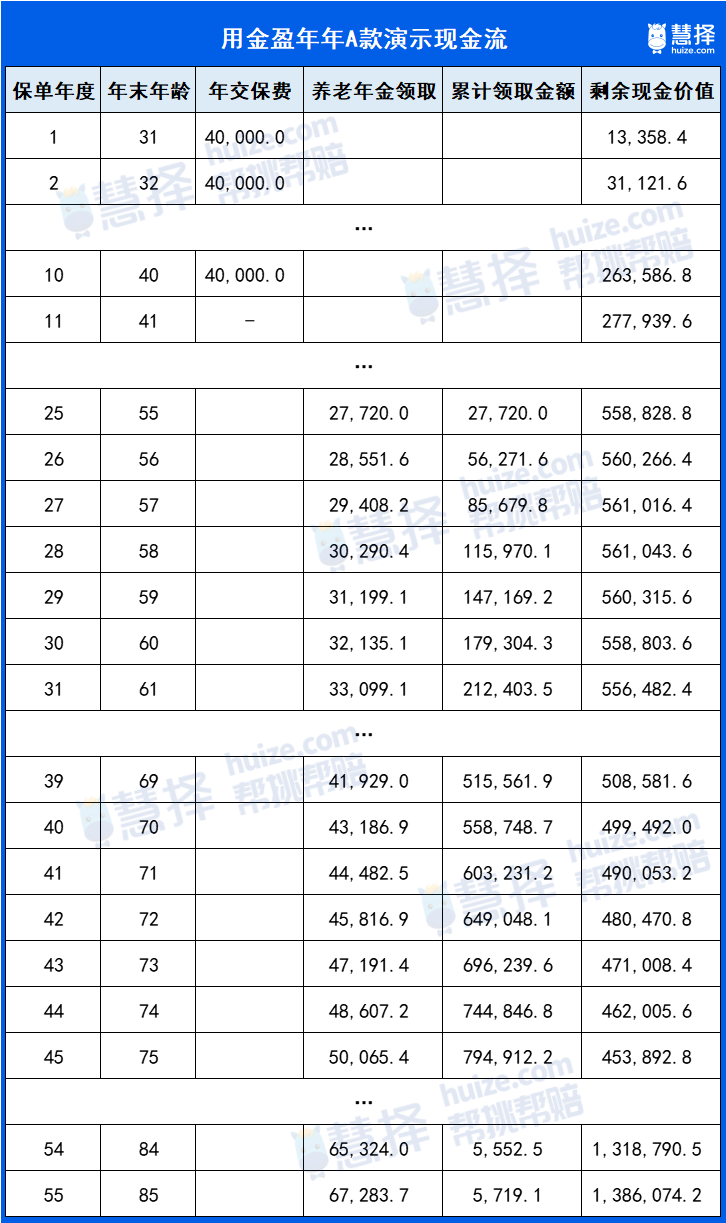 金盈年年A款在55-75歲的時(shí)候,累計(jì)能領(lǐng)出79.49萬,多出來的43.09萬,咱們可以放著備用。