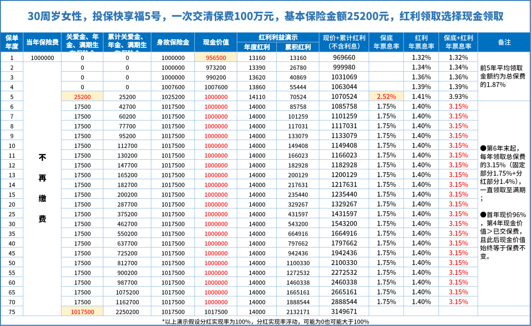 邏輯很簡(jiǎn)單,依然是以快享福5號(hào)30歲女性、躉交100萬、紅利領(lǐng)取方式選擇累計(jì)生息為例: