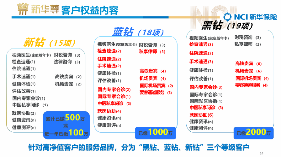1、當(dāng)年度投保保費(fèi)100萬即可達(dá)標(biāo)“新華尊”新鉆客戶,能享受視頻醫(yī)生、財(cái)稅/法律咨詢、居家養(yǎng)老改造等15項(xiàng)服務(wù);